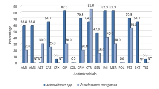 AMI - amikacin; AMS - ampicillin-sulbactam; AZT - azithromycin; CAZ - ceftazidime; CFX - cefuroxime; CIP - ciprofloxacin; COL - colistin; CPM - cefepime; CTR - ceftriaxone; GEN - gentamicin; IMI - imipenem; MER - meropenem; POL - polymyxin B; PTZ - piperacillin-tazobactam; SXT - trimethoprim-sulfamethoxazole; TIG - tigecycline; NT - not tested.