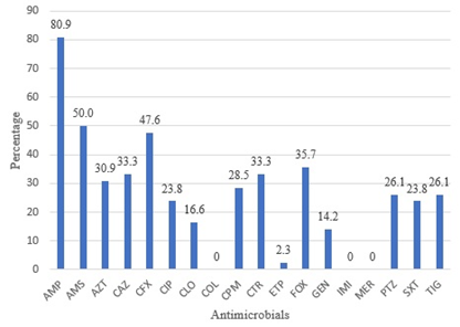 Among enterobacteria, no resistance to carbapenems and colistin was observed. However, 80.9% of isolates showed resistance to ampicillin, 50.0% to ampicillin-sulbactam, and 47.6% to cefuroxime (Figure 2).