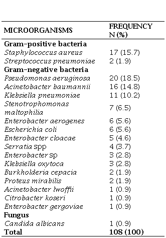 Regarding the infectious etiology, microorganisms can vary greatly according to the institution. Brazilian studies show that the microorganisms predominantly isolated from cultures of tracheal secretions are gram-negative bacteria, mainly Acinetobacter baumannii and Pseudomonas aeruginosa, in addition to gram-positive ones, such as methicillin-resistant Staphylococcus aureus (MRSA).5,7