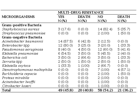 Considering the 107 bacterial isolates obtained from the cultures, 49 (45.8%) were classified as multi-resistant. The most frequent multi-drug resistant bacteria were A. baumannii (87.5% of resistant strains) and Enterobacter spp (80% of resistant strains) (Table 1). There was no statistically significant association between bacterial multi-drug resistance and patient mortality (p=0.482) (Table 2). Patients infected with multi-drug resistant bacteria were hospitalized for longer when compared to other patients, with medians of 34 and 27 days, respectively (p=0.067). ICU length of stay was also longer among patients with multi-drug resistant bacteria (medians of 20 and 16 days; p=0.144).