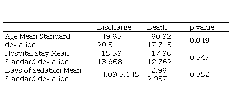Table 1 shows that the age of the patients relates to the outcome (p = 0.049), based on the relationship between outcome and age, hospital stay and days of sedation. With higher mortality for patients with older age.