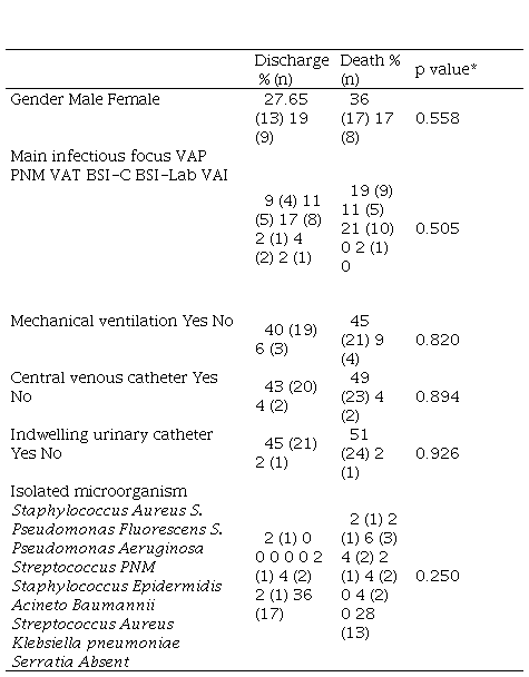 Table 2 describes the analysis of the relationship between outcomes and variables of gender, infectious focus, mechanical ventilation, central venous catheter, indwelling urinary catheter and isolated microorganism, without significant association.