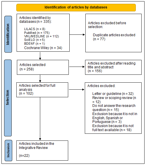 The inclusion criteria were articles from primary studies published in Portuguese, English or Spanish, available as full texts for reading in full. This integrative review excluded studies that did not answer the research question or did not contemplate the objective, in addition to articles in the format of letters, consensus and guidelines, in addition to review articles (narrative, integrative and scoping review).