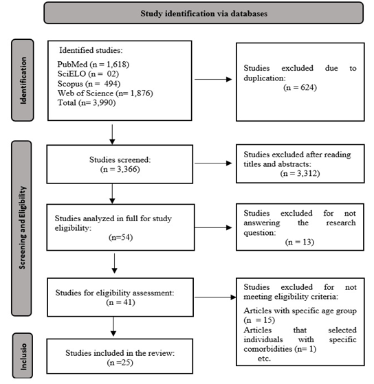 In study selection, we included original studies, made available free of charge, in Portuguese, English or Spanish, and without time frame. Editorials, letters to the editor, expert opinions, reviews (literary, integrative and systematic), theses, dissertations, studies that did not answer the guiding research question and studies in which research was conducted with groups of patients with specific age and/or comorbidity were excluded.
