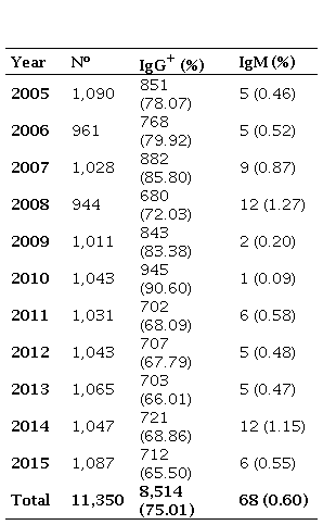 During the selected period, 11,350 pregnant women were assisted. Of these, 8,514 (75%) had IgG anti-T. gondii antibodies (Table 1). The average annual number of cases was 774. A reduction and stabilization in the number of cases was observed after 2010. Pregnant women were significantly associated with seropisitivity of anti-T. gondii.
