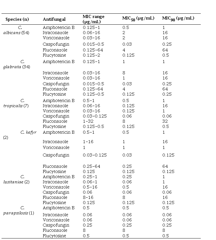 Determined by broth microdilution; 91 Candida species were susceptible to caspofungin, 8 were moderately susceptible, and 1 was resistant, 23 Candida species were susceptible to fluconazole, 37 were dose-related susceptible, and 40 were resistant, 13 Candida species were susceptible to itraconazole, 18 were dose-dependent susceptible, and 69 were resistant. There were 17 (25.8%) voriconazole susceptible strains, 13 dose-dependent susceptible (19.7%) strains, and 36 (54.5%) resistant Candidastrains (C. glabrata not included due to CLSI statement: current data are insufficient to demonstrate a correlation between in vitro susceptibility testing and clinical outcome). Among the 100 Candida strains examined, resistant strains against amphotericin B (≥2 µg/mL) and flucytosine (≥32 µg/mL) were not detected. MIC range, MIC50, and MIC90 values of antifungal drugs for Candida species are given in Table 1. Also, detailed antifungal susceptibility results of different Candida species were given in Table 2.