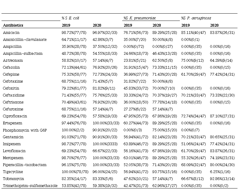 In 2019, the main GNB isolates showed the following sensitivity profiles: E. coli showed lower sensitivity to sulfonamides (53.85%), monobactams (58.82%) and penicillin (62.01%); K. pneumoniae showed lower sensitivity to phosphomycin (0%), to monobactams (58.82%) and to penicillin (34.09%); P. aeruginosa was less sensitive to phosphomycin (0%), glycylcycline (0%) and sulfonamides (0%). While GPC isolates showed the following sensitivity profile: S. epidermidis showed lower sensitivity to cephalosporins (7.78%), penicillin (15.05%) and quinolones (39.09%); S. aureus showed lower sensitivity to penicillin (41.03%), cephalosporins (72.92%) and quinolones (92.68%); and S. haemolyticus showed lower sensitivity to penicillin (16.67%), cephalosporins (33.33%) and aminoglycosides (37.50%) (Table 1).