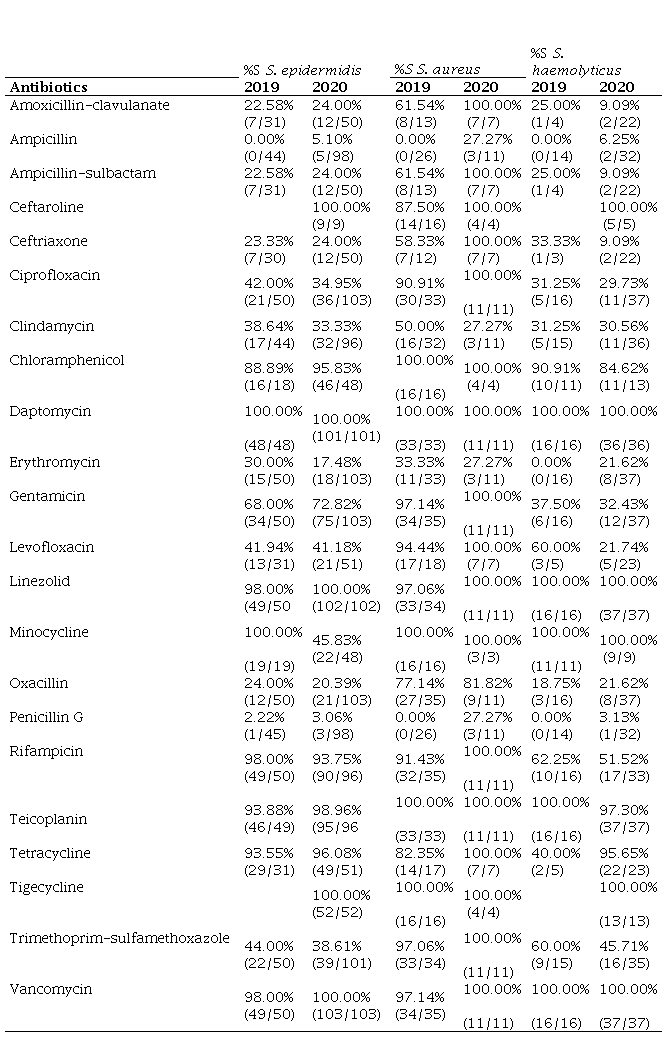 GPC isolates such as S. epidermidis demonstrated a percentage decrease in sensitivity to ciprofloxacin, clindamycin, erythromycin, levofloxacin, minocycline, oxacillin, rifampicin and trimethopim-sulfamethoxazole. A change in the susceptibility of S. epidermidis to minocycline was observed (p=0.01), representing a decrease in sensitivity when compared to the years 2019 and 2020. S. aureus isolates showed a decrease in sensitivity to clindamycin and erythromycin. An alteration was observed in the susceptibility of S. aureus to penicillin G (p=3.41), representing an increase in sensitivity when compared to the years 2019 and 2020. S. haemolyticus isolates showed a decrease in the percentage sensitivity to amoxicillin-clavulanate, ampicillin-sulbactam, ceftriaxone, ciprofloxacin, clindamycin, chloramphenicol, levofloxacin, rifampicin and trimethoprim-sulfamethoxazole. However, no statistical difference was observed in susceptibility in other antibiotics tested (Table 3).