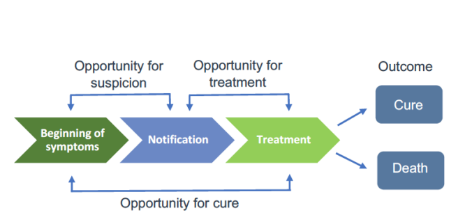 Calculations of intervals in days were performed, considering the dates of suspicion (notification), date of onset of symptoms, date of start of treatment and date of completion of the case (outcome), as shown in Figure 2.