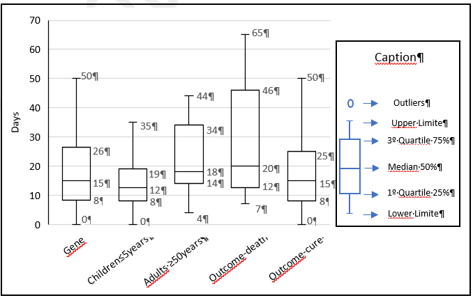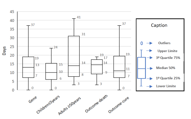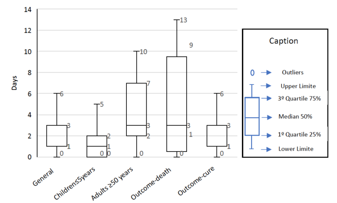 The time elapsed from the onset of symptoms to suspicion in all assessed individuals was 13 days (Md = 13). The shortest interval for disease suspicion occurred in children younger than 5 years (Md = 10 days) and in those who had a favorable outcome for cure (Md = 11 days). Individuals who died had higher medians (Md = 14) as well as the group of older patients (≥ 50 years), as can be seen in Figure 3.