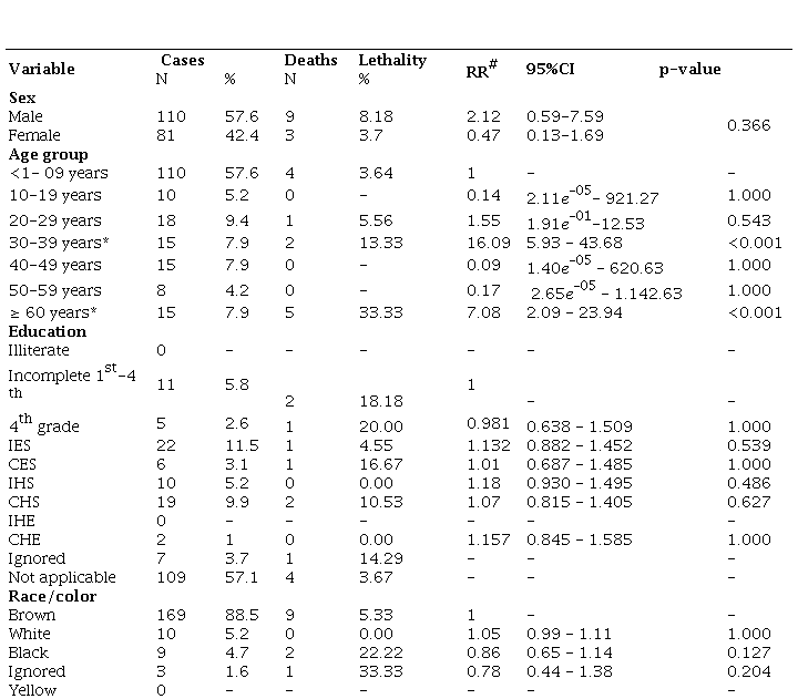 As for analysis by age group, children (< 10 years) totaled 110 cases, which corresponds to more than half of all records; however, they maintained low lethality when compared to other age groups, especially those of young adults (30 to 39 years old) and older adults (≥ 60 years old), who showed a statistically significant association (p< 0.001), with a high risk of progressing to death when compared to younger people (RR= 16.09 and 7.08).