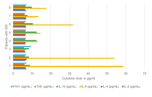 For cytokines, the study showed that interleukin 6 occurred at high levels in 87.5% of the measured samples. Inflammatory markers such as CRP and IL-6 in lesion fluid hold promise for predicting SSI in the clinic. 24 Serial estimation of postoperative CRP and IL 6 can predict infections and can be used routinely in general surgical practice. 25