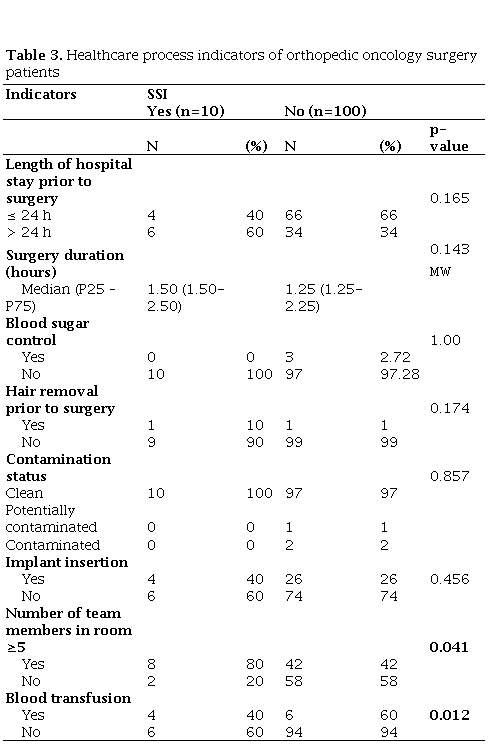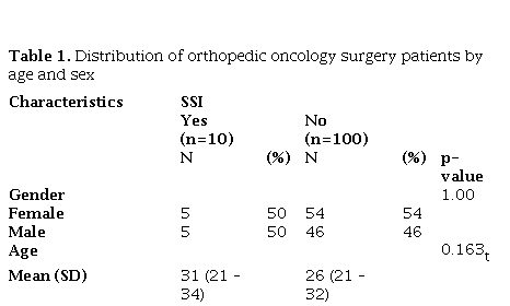During the study period, 110 patients undergoing orthopedic surgical procedures diagnosed with bone cancer were recruited. Of this total, 10/110 (9.1%) had SSI. Most patients were female, five with SSI and 54 without SSI (59%), and the mean age was 31 years of age for patients with SSI and 26 years of age for patients without SSI (Table 1).