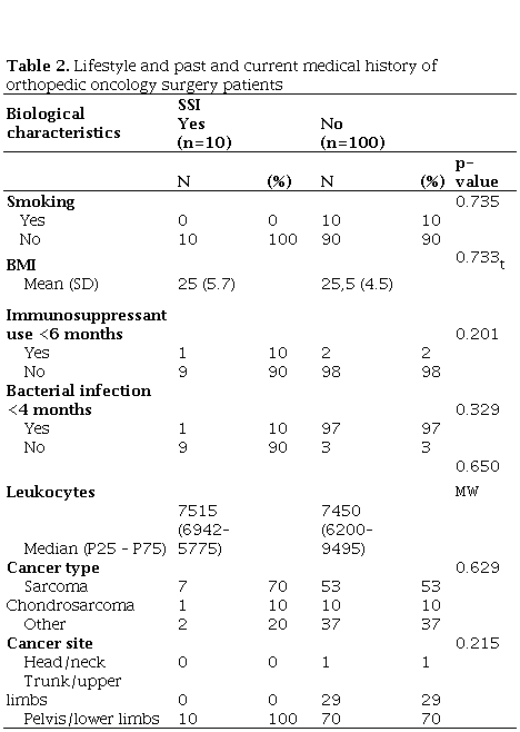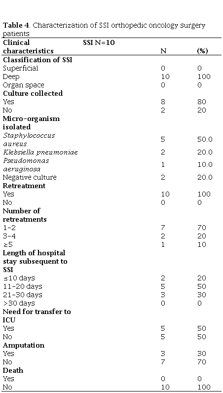 The results of this study indicate an incidence of infection of 9.09%, a similar value reported in a study of risk factors for SSI in orthopedic oncology that found that 10.9% of patients developed SSI 5. On the other hand, the incidence of postoperative infection of deep bone tumors ranged from 3.2% to 10.9%. 1,6 All the procedures included in the study were classified as clean and the incidence of SSI for this category of procedure was higher than the rate considered acceptable (1 to 5%)9.
