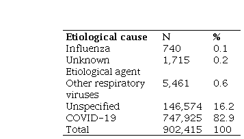 It was observed that 82.9% (n=747,925) of SARS cases were due to SARS-CoV-2, the etiologic agent of COVID-19, and that the other causes added together were responsible for the remaining 16.9% (n=154,490) of hospitalizations. The profile of hospitalizations by SARS classification is shown in Table 2.