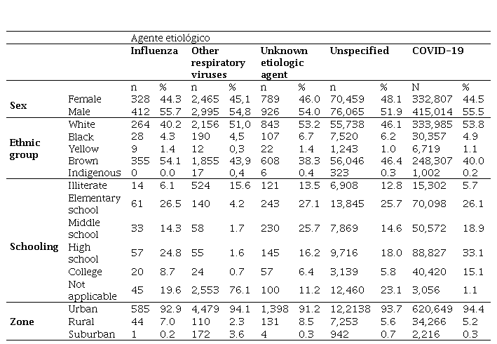 When analyzing table 2, it was observed that male sex was predominant in all types of SARS, the same occurring with the ethnicity that was predominantly white. The occurrence of SARS stratified by schooling was variable, where in SARS due to influenza (26.5%), in unknown etiological agent (27.1%) and not specific (25.7%), individuals with elementary education between 1st and 5th grade were predominant, while in SARS by other etiological agents there was a higher occurrence in individuals where schooling is not applied, such as immigrants or indigenous people, and in SARS due to COVID-19, the predominant level of schooling was high school (33.1%). The predominant place of residence in all types of SARS was urban.