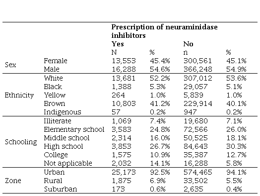 The prescription of neuraminidase inhibitors was associated with ethnicity (p<0.001), schooling (p<0.001) and zone of residence (p<0.001), with no association with gender.