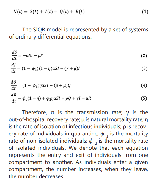 The model used was the SIQR epidemiological model. The SIQR model is an extension of the SIR model, and divides the population into four compartments that indicate the situation of each individual in relation to the development of the disease in each unit of time (t), namely: (S) individuals susceptible to being contaminated; (I) individuals who have been infected and can transmit the disease to susceptible individuals; (Q) individuals who acquired the disease and are isolated, i.e., they were diagnosed and are receiving treatment away from interaction with other people; and (R) individuals who have received treatment and are recovered. Therefore, the total population of the region under study can be written, which is represented by the constant N as the sum of all the compartments mentioned above,2,4,7,11 namely: