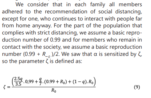 In order to know the number of healthy people who withdrew from interaction with society, we assume that a percentage of the population 𝑞 strictly adhered to the recommendation to stay at home and the rest went about their lives normally. For this, we use the average number of people per family, according to IBGE, it has an average of 3.5 people per family.15