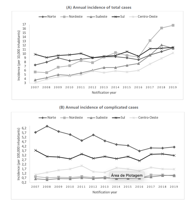 The temporal trend for the annual incidence of total cases (AITC) decreased in the Brazilian Northeast (-63.36), Southeast (-44.83), and Midwest (-58.18) regions, increasing in the North (+55.78) and South (+16.81) (Table 2 and Figure 1). The annual incidence of complicated cases (AICC) decreased in the North, but increased in the Southeast. We should also highlight the increase in the AICC in Northeast (+9.30%) and Midwest (+56.48%) regions, although we found no statistical significance in the tested models, which showed p>0.05, as shown in Table 2.