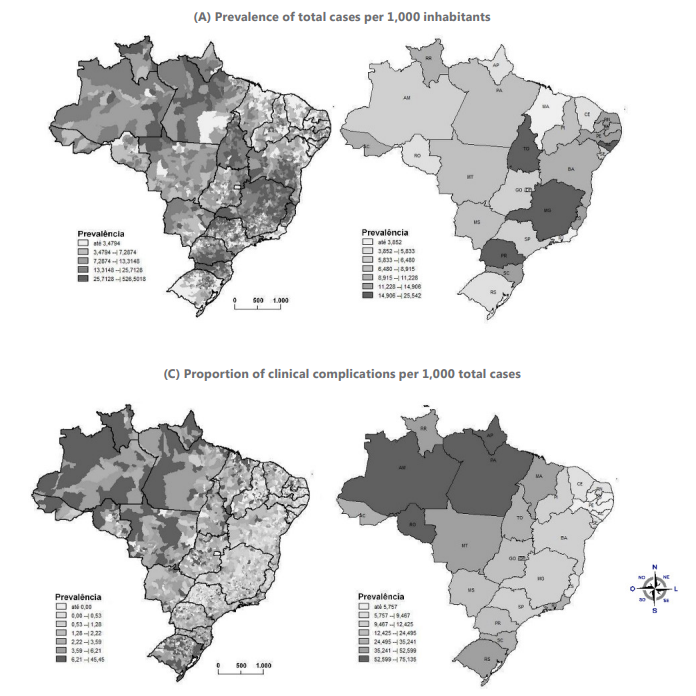 Note that the states of Alagoas, Tocantins, Minas Gerais, and Paraná showed a higher prevalence of total cases, and Amazonas, Rondônia, Amapá, and Pará, the highest proportion of clinical complications (Figure 2).