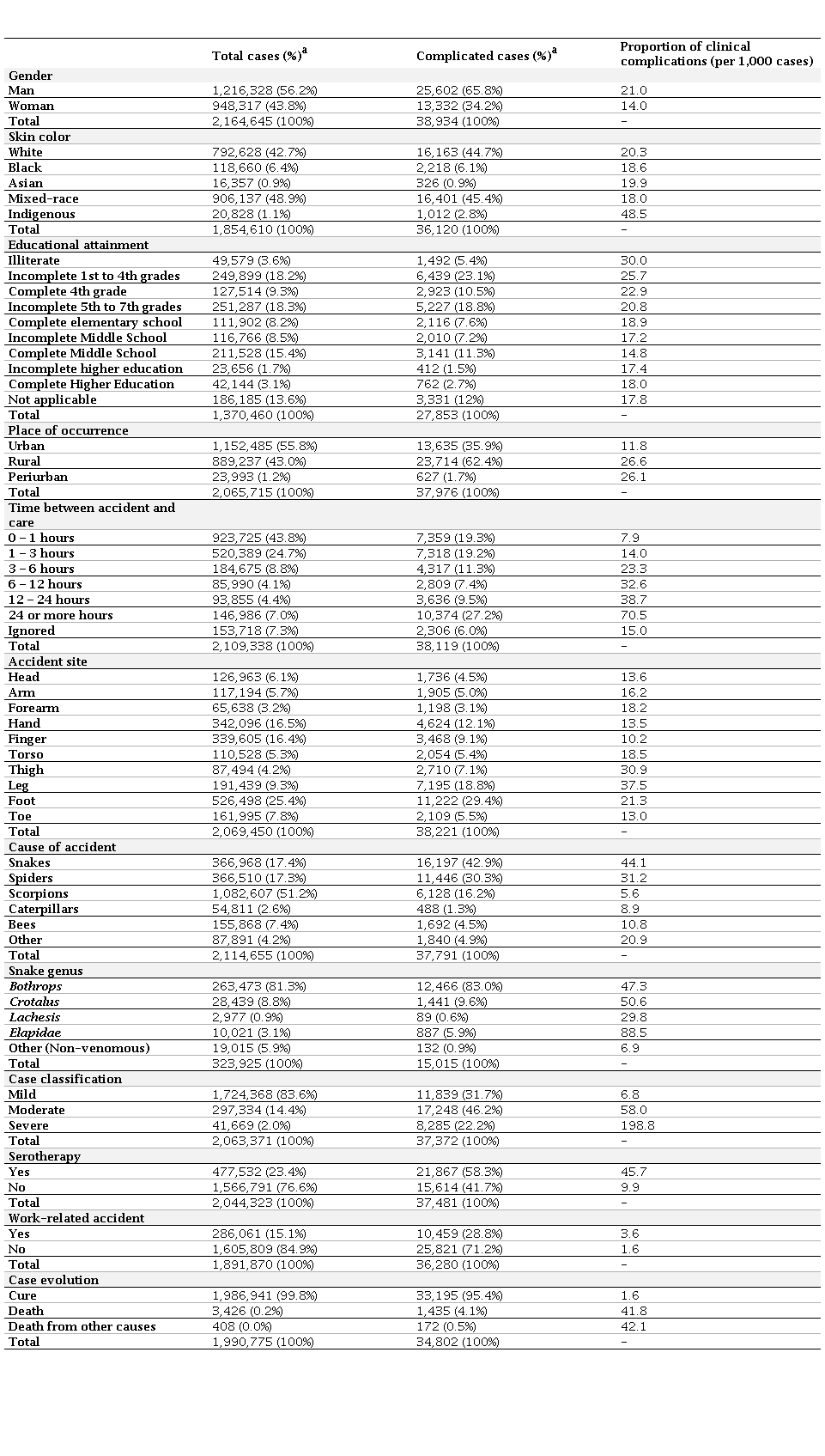 This study found a higher proportion of clinical complications among illiterates, Indigenous people, men, and rural population, users whose accidents stemmed from snakes, and those who had received late medical-hospital care. We also observed a higher proportion of clinical complications in severe cases, those which required serotherapy, and deaths. The annual incidence of complicated cases increases in the Southeast, as well as the proportion of clinical complications in the states of Amazonas, Rondônia, Amapá, and Pará.