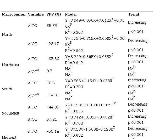 Temporal trend analysis was performed using polynomial regression, which was tested for linear, quadratic, cubic, and exponential models. Our final model depended on statistical significance, the highest coefficient of determination (r2), and final adequacy in relation to how notifications tended to behave graphically over time. Thus, models whose probability of type-I error (alpha) remained below 5% were considered statistically significant.