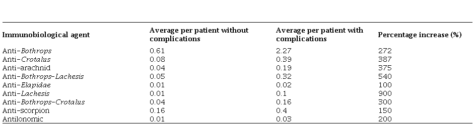 The percentage of the average use of all immunobiological types to manage cases increased due to case complications, as with anti-Lachesis serum (900%) (Table 3).