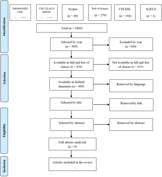 Searches in the databases were carried out by two researchers independently, between May and June 2021, and resulted in a total of 1069 articles. For selection, the analysis criteria shown in Flowchart 01 were used.