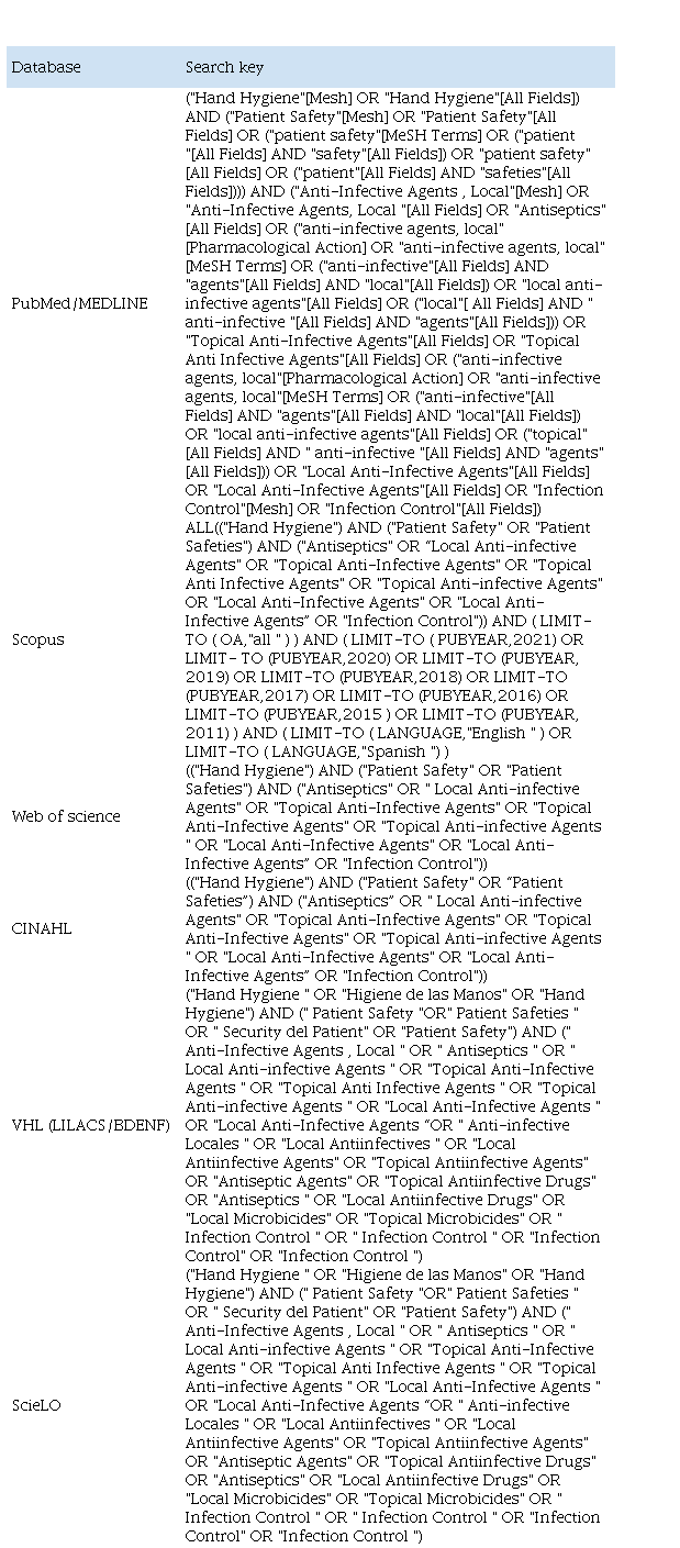 To carry out the search in the databases, the following keywords were chosen, according to the structured and multilingual vocabulary of Descriptors in Health Sciences (DeCS): "Segurançado Paciente", "Higienedas Mãos", "Anti-Infecciosos Locais". The following Medical Subject Headings (MeSH) descriptors were also used: "Hand Hygiene"[Mesh], "Patient Safety"[Mesh], "Anti-Infective Agents, Local"[Mesh], "Infection Control"[Mesh]. Articles in Portuguese, English and Spanish, with content available in full, online and free of charge, published between 2010 and 2021, which were in accordance with the pre-established theme, were included. The choice of this period was due to the launch of the Multimodal Strategy to improve compliance with HH practices by the WHO. Editorials and news as well as articles in other languages, not available in full or free of charge, and that did not have thematic significance for the objectives of work, were excluded.