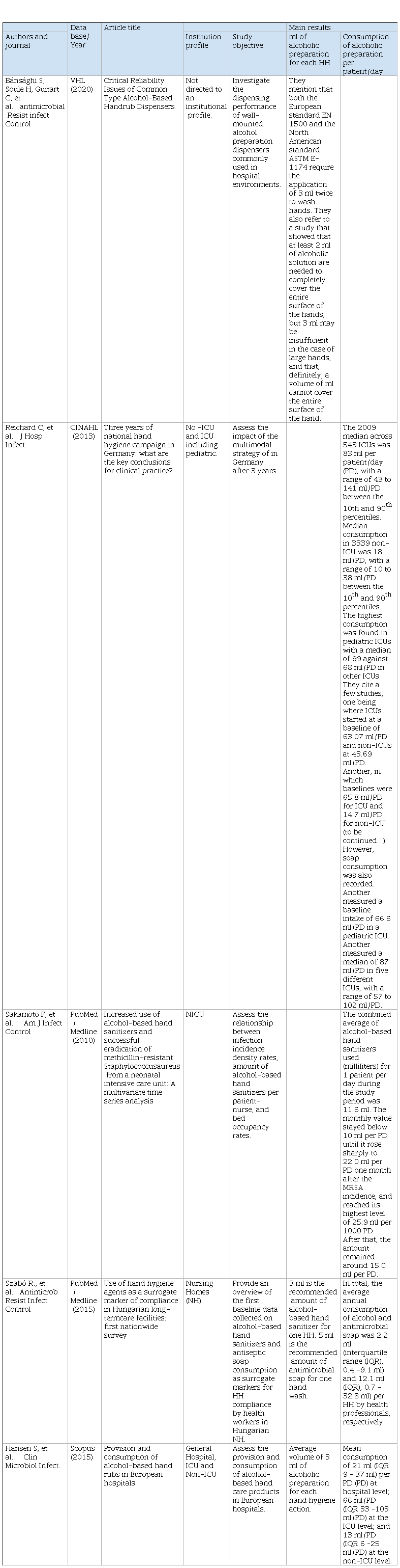 Although the studies do not contemplate contexts similar to Day Hospital and/or outpatient care, they provide relevant information to support the definition of alcoholic preparation consumption for HH and which were divided into two variables: ml of alcoholic preparation for each HH and alcoholic preparation consumption per PD. Of the five articles, two contained information related to both analytical categories: one only about the number of milliliters to be used for proper HH and two only about the alcoholic preparation consumption for HH identified in the institutions.