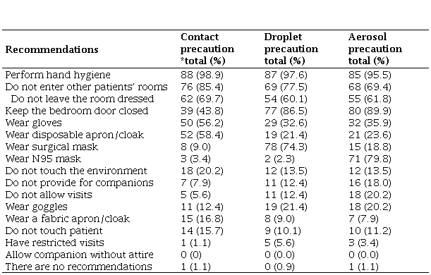 Among the recommendations for CV of patients hospitalized in SP, HH was the most frequent and equally mentioned in all types of precautions. Although it is recognized as the most economical and efficient strategy to prevent the transmission of microorganisms in health services,12,14 CV HH is often neglected in health services and little addressed in the literature.18 A descriptive study carried out with CV in pediatric hospitals and maternity hospitals in Canada found that the rate compliance with HH of CV was 10.3% and that less than half claimed to have received guidance on this topic during hospitalization.18