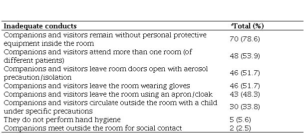 Among the main results achieved, HH was the most indicated recommendation (>95.0%). As for non-conformities, staying in the room without attire (78.6%), going to other rooms (53.9%) and keeping doors open as AP (51.7%) stood out. Regarding the strategies adopted to guide companions/visitors, there was a predominance of individual verbal guidance (92.4%). The main barrier cited was the lack of institutional policy (56.2%).