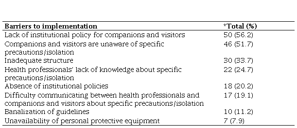 With regard to the main inappropriate behaviors presented by CV, it is worth mentioning staying in the room without PPE, going to different patients’ rooms and leaving the doors of rooms of patients in AP open. As barriers to implementation, infection preventionists mentioned the lack of institutional policies and the CV’s lack of knowledge about SP and transmission of microorganisms.