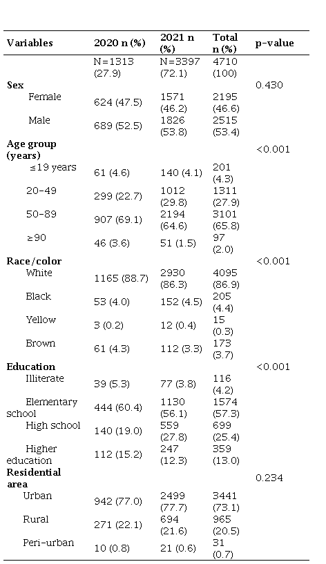A total of 4,710 people with SARS symptoms were reported during the study period, 1,313 in 2020 and 3,397 in 2021. In 2020, 701 (53.4%) had SARS due to COVID-19; 604 (46.0%) patients had unspecified SARS; and 4 (0.3%) patients had SARS due to another virus or etiological agent (leptospirosis and dengue). In 2021, there were 2,971 (87.5%) reports of SARS cases due to COVID-19; 404 (11.9%) patients had unspecified SARS; and 5 (0.1%) had SARS caused by another virus or etiological agent (unspecified). Among the reported cases, 2,515 were male (53.4%) and 3,101 (65.8%) were in the age group of 50-89 years. White race/color was predominant (86.9%). Regarding education, 1,574 (57.4%) had elementary school and 3,441 (73.1%) lived in urban areas (Table 1).