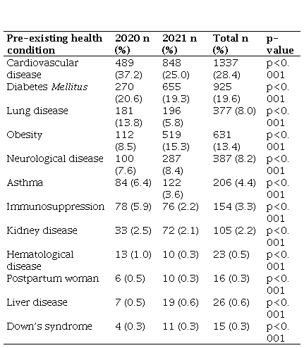 Table 2 presents pre-existing health conditions in the general study population. In 2020 and 2021, the most common pre-existing health condition was cardiovascular disease (37.2% vs 25.0%), being significantly higher in 2020 (p<0.001), followed by Diabetes Mellitus (20.6% vs. 19.3%), significantly higher in 2020 (p<0.001). Lung diseases were the third most cited preexisting health condition (13.8%) in 2020, being significantly higher than in 2021 (p<0.001). Finally, obesity was the third most cited preexisting health condition in 2021 (8.5%), being significantly higher than in 2020 (p<0.001).