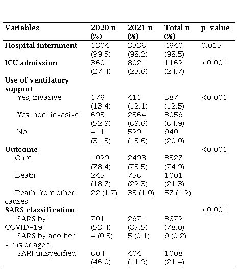 Regarding the hospital admission profile, it was observed that, from 2020 to 2021, there was a decrease in the prevalence of hospital admissions (99.3% vs 98.3%, p<0.001), ICU admissions (27.4% vs 23.6%, p<0.001), use of invasive ventilatory support (13.4% vs 12.1% p<0.001). Furthermore, from 2020 to 2021, an increase in the prevalence of death (18.7% vs 22.3%, p<0.001) and SARS reports due to COVID-19 (53.4% vs 87.5%, p<0.001) was observed (Table 3