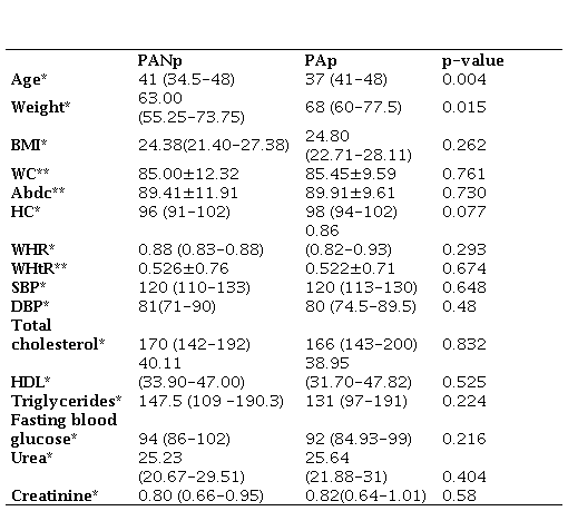 Other risk factors (RF) were also analyzed, however p>0.05 in all, not showing statistical significance, namely waist-hip ratio (WHR), waist-height ratio (WHtR), total cholesterol (TC), HDL, TG, fasting blood glucose (FBG), Body Mass Index (BMI), waist circumference (WC), abdominal circumference (Abdc), hip circumference (HC), urea and creatinine. The investigation of these data in the PANp group showed higher medians in WHR [0.88 (0.83-0.88)], WHtR [0.526±0.76], TC, [170 (142-192)], HDL [40.11 (33.90-47.00)], TG [147.5 (109 -190.3)] and FBG [94 (86-102)].