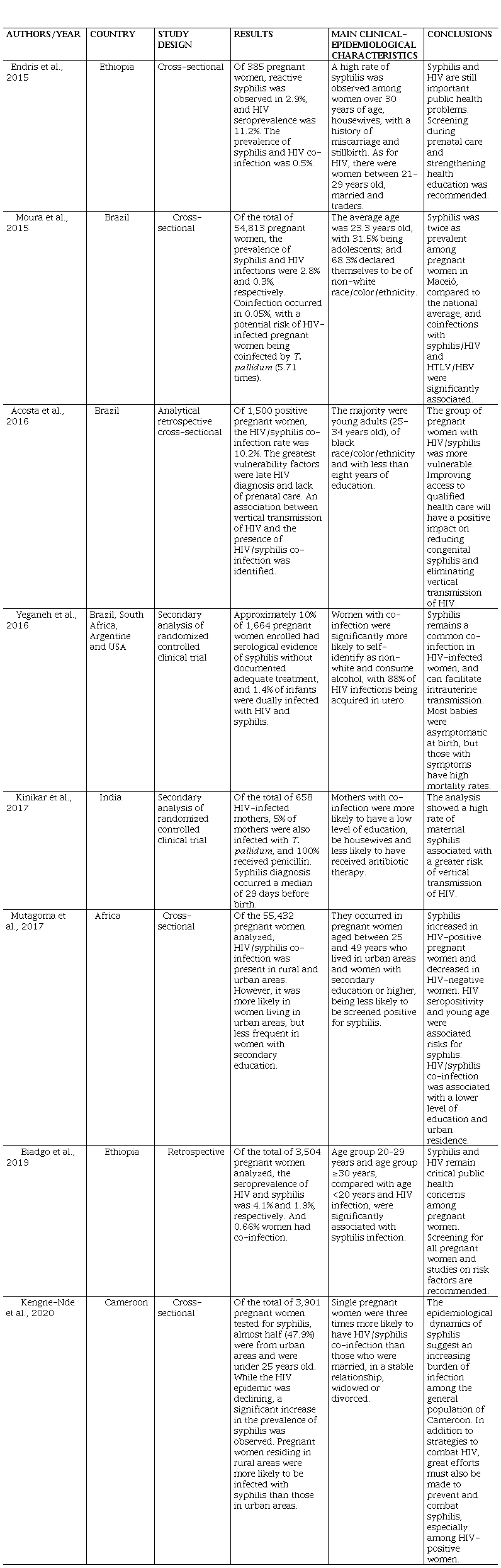 From this perspective, the objective was to synthesize scientific evidence about the clinical-epidemiological characteristics of pregnant women with HIV/syphilis co-infection globally.