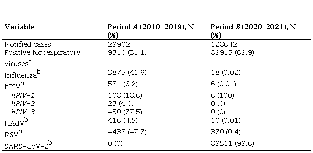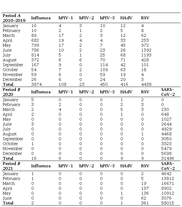 The monthly number of SARI cases positive for each respiratory is shown in Table 5. Data related to period B was obtained until June 2021; to avoid bias when comparing period B with period A (which contains data from January to December of all years), period B was divided into two segments (period B-2020 and period B-2021).