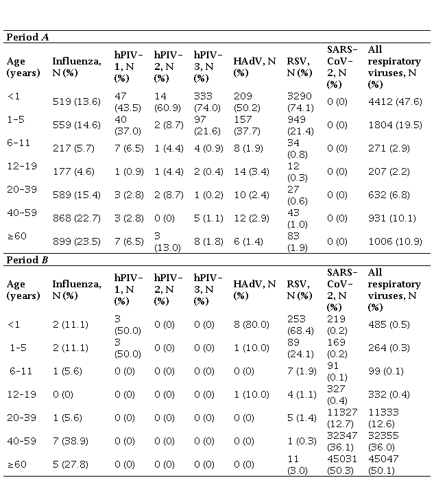 In period A, most infections occurred between April and August. There was a predominance of Influenza and RSV between April and August (3,453 and 4,238 cases, respectively), with the number of cases decreasing in late winter and early spring (221 and 119 cases, respectively). HAdV circulated mainly in autumn (90 cases) and spring (282 cases). Regarding hPIV, the dominant type was hPIV-3, with peaks in spring (282 cases) and winter (118 cases); whereas most cases of hPIV-1 were observed during fall (53 cases), and of hPIV-2 in winter (9 cases) and autumn (8 cases).