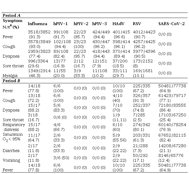 As shown in Table 3, cough, fever, dyspnea, and sore throat were the symptoms analyzed in both periods, whereas other symptoms were evaluated separately because not all of them were reported in both periods. The frequency of cases with fever and cough was higher in period A (res.adj=24.67, 9.27 respectively), while dyspnea and sore throat were more reported in period B (res.adj=19.51, 21.26); our analysis revealed an association between patients' symptoms and period (p<0.0001). In period B, dyspnea was the most predominant symptom, observed in 86% of the cases. Other symptoms were included in the notification forms of SARI in period B, including respiratory distress (in 77% of the cases), O2 saturation <95% (82%), diarrhea (21%) and vomiting (12%).
