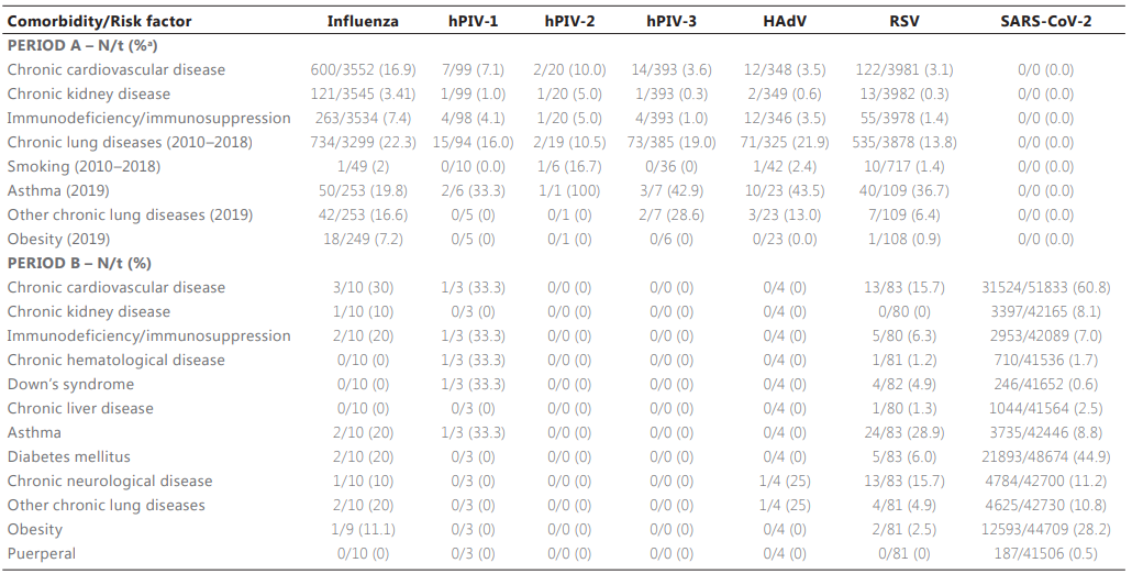 In period A,the percentage of individuals with a given comorbidity was similar among the SARI cases regardless of the viral type; in contrast, the most common comorbidities observed in period B were mainly in individuals infected by SARS-CoV-2. This might have contributed for a higher fatality in period B compared to period A (37% and 6.7%, respectively), considering that patients with some comorbidities are more susceptible to developing severe COVID-19.15,20-24