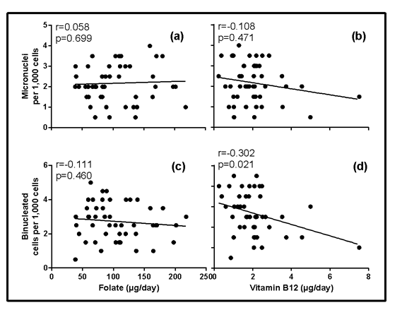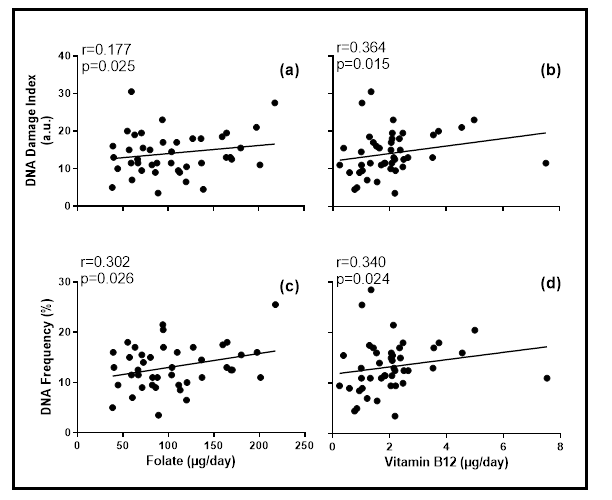 Correlation analyses identified important relationships between the index and the frequency of DNA damage with vitamins in diet and serum. Folate intake (r=0.177; p=0.025 and r=0.302; p=0.026, respectively; Figure 1a, c) and vitamin B12 intake (r=0.364, p=0.015 and r=0.340, p=0.024, respectively; Figure 1b, d) were significantly associated with the damage index and frequency in DNA.