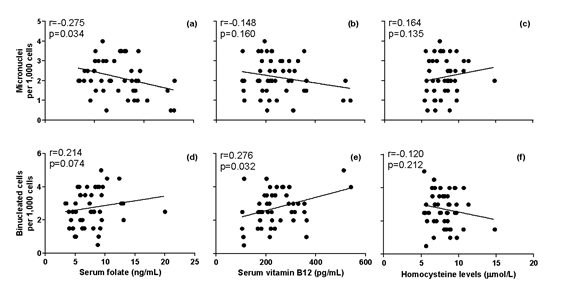 Regarding the BMCyt assay, only vitamin B12 intake was negatively associated with binucleated cells frequency (r=−0.302, p=0.021; Figure 3d). In serum, there was a significant negative association between folate and the micronuclei frequency (r=−0.275; p=0.034; Figure 4a) and a significant positive association between vitamin B12 and binucleated cells frequency (r=0.276, p=0.032; Figure 4e). Hcy levels were not significantly associated with micronuclei frequency nor binucleated cells frequency (p>0.05).