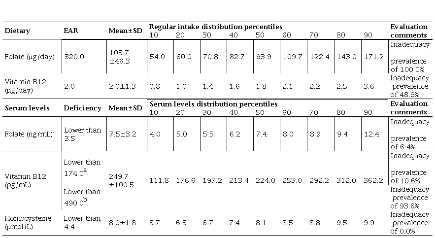In this study, the prevalence of folate serum levels inadequacy was lower than in the diet (6.4% vs. 100%). As for vitamin B12 serum levels, 10.6% of the individuals had levels below 174 pg/mL, and 93.6% of women had figures below 490 pg/mL. Those results were lower when compared to an Australian study that evaluated young adult women.9