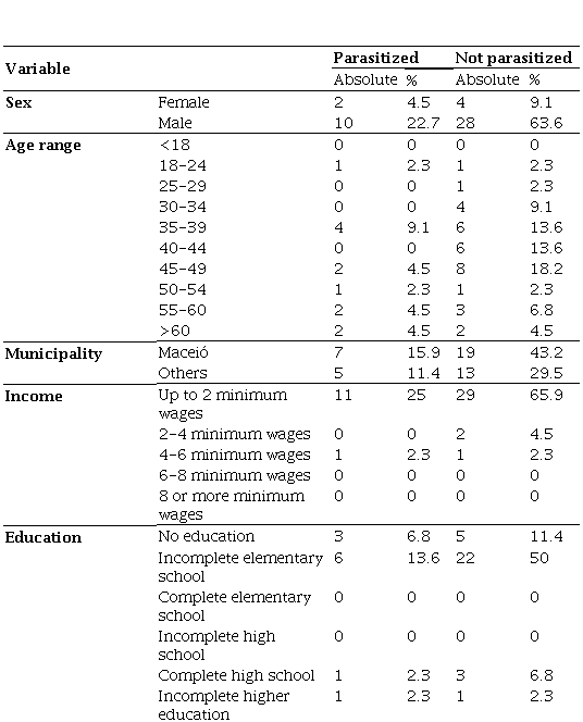 Table 1 describes the sample socioeconomic profile. The majority of those infected with parasites were male (22.7%), aged between 35 and 39 years (9.1%), lived in the municipality of Maceió (15.9%), had incomplete elementary school (13.6%), had an income equal to or less than 2 minimum wages (25%) and were single (11.4%).