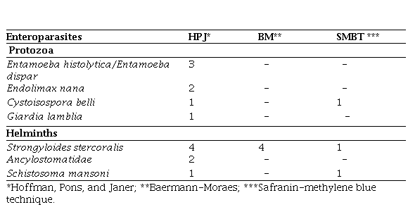 All parasites were detected using the HPJ method after analyzing the same fecal material. Thus, it is inferred that this technique was the most sensitive and comprehensive in diagnosing these enteroparasites, making it the most effective.25