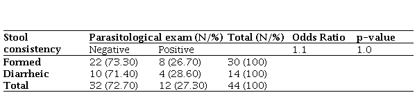 The macroscopic examination of the stools allowed the identification of 14 (31.81%) diarrheal samples, as shown in Table 4. Among them, only four (28.70%) were parasitized. Furthermore, mucus was found in five (35.71%) of the diarrheal samples and in seven (15.90%) out of the 44 samples collected. The relationship between the analyzed stool consistency and parasitized individuals, according to Fisher’s exact test, was not statistically significant (p=1.0). The odds ratio of 1.1 suggests a slight, but not substantial, increase in the odds of testing positive for parasites in individuals with diarrheic stool compared to those with formed stool. However, this is not statistically significant.