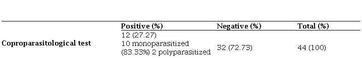 As shown in Table 2, parasitic infection was confirmed through coproparasitological exams in 27.27% (12) of patients. Among these, 83.33% (10) were infected with a single parasite species (monoparasitism), whereas 16.67% (2) were infected with multiple parasite species (polyparasitism).